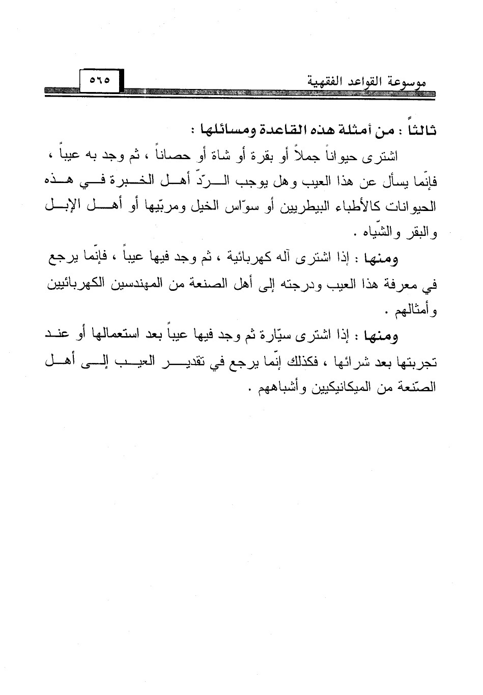 ومنها: إذا اشترى آلة كهربائية، ثم وجد فيها عيباً، فإنّما يرجع في معرفة هذا العيب ودرجته إلى أهل الصنعة من المهندسين الكهربائيين وأمثالهم.