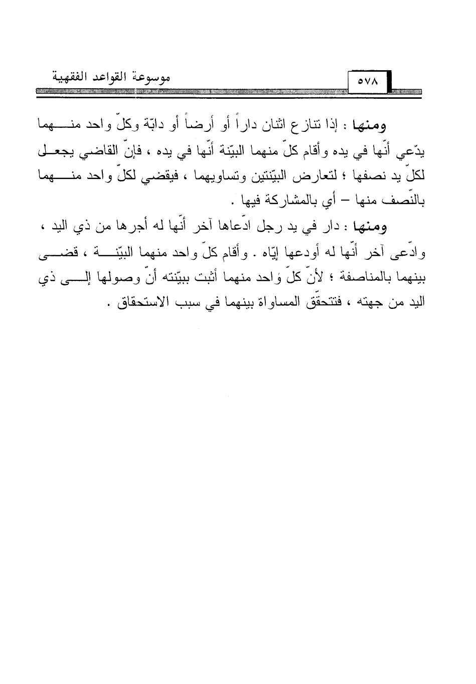 ومنها: إذا تنازع اثنان داراً أو أرضاً أو دابّة وكلّ واحد منهما يدّعي أنّها في يده وأقام كلّ منهما البيّنة أنّها في يده، فإنّ القاضي يجعل لكلّ يد نصفها؛ لتعارض البيّنتين وتساويهما، فيقضي لكلّ واحد منهما بالنّصف منها - أي بالمشاركة فيها.