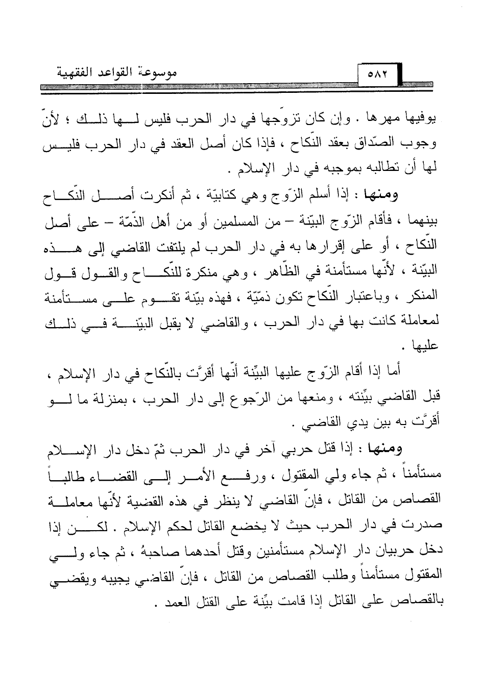 ومنها: إذا قتل حربي آخر في دار الحرب ثمّ دخل دار الإسلام مستأمناً، ثم جاء ولي المقتول، ورفع الأمر إلى القضاء طالباً القصاص من القاتل، فإنّ القاضي لا ينظر في هذه القضية لأنّها معاملة صدرت في دار الحرب حيث لا يخضع القاتل لحكم الإسلام. لكن إذا دخل حربيان دار الإِسلام مستأمنين وقتل أحدهما صاحبهُ، ثم جاء ولي المقتول مستأمناً وطلب القصاص من القاتل، فإنّ القاضي يجيبه ويقضي بالقصاص على القاتل إذا قامت بيِّنة على القتل العمد.