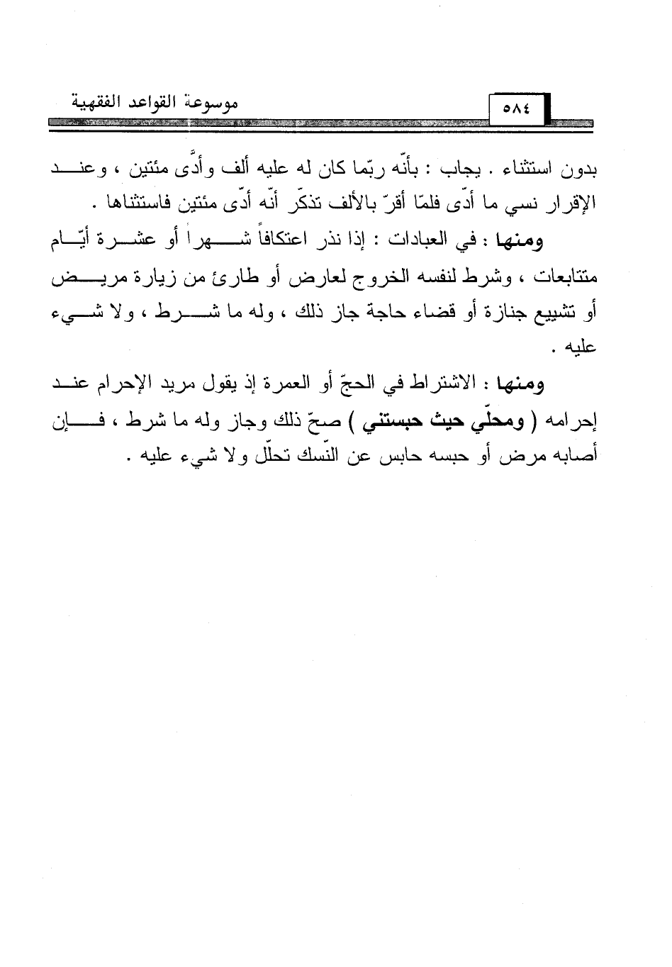 ومنها: الاشتراط في الحجّ أو العمرة إذ يقول مريد الإحرام عند إحرامه (ومحلّي حيث حبستني) صحّ ذلك وجاز وله ما شرط، فإن أصابه مرض أو حبسه حابس عن النّسك تحلّل ولا شيء عليه.