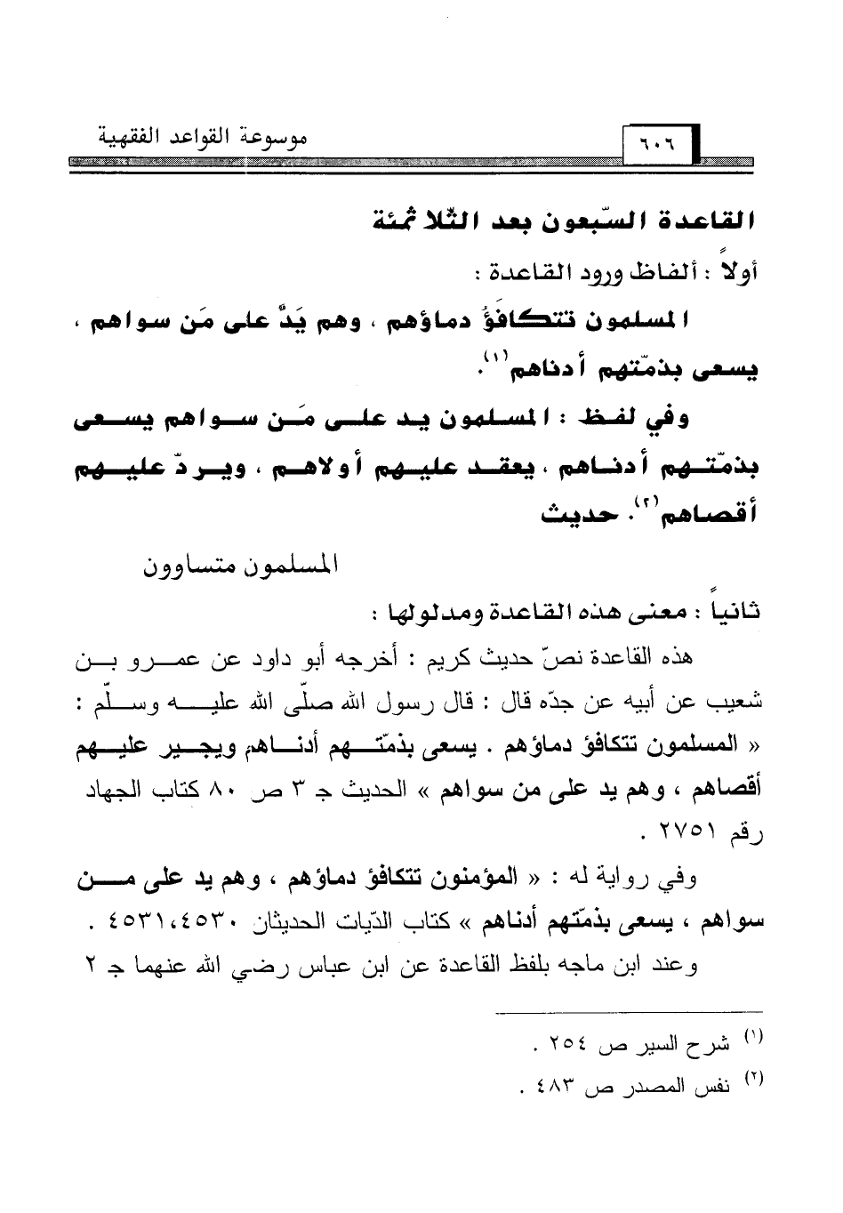 هذه القاعدة نصّ حديث كريم: أخرجه أبو داود عن عمرو بن شعيب عن أبيه عن جدّه قال: قال رسول الله صلّى الله عليه وسلّم: "المسلمون تتكافؤ دماؤهم. يسعى بذمّتهم أدناهم ويجير عليهم أقصاهم، وهم يد على من سواهم" الحديث جـ 3 ص 80 كتاب الجهاد رقم 2751.