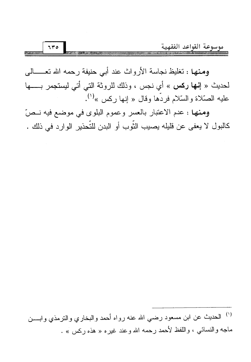 ومنها: تغليظ نجاسة الأرواث عند أبي حنيفة رحمه الله تعالى لحديث "إنها ركس" أي نجس، وذلك للروثة التي أتي ليستجمر بها عليه الصّلاة والسّلام فردّها وقال "إنها ركس" (¬1).