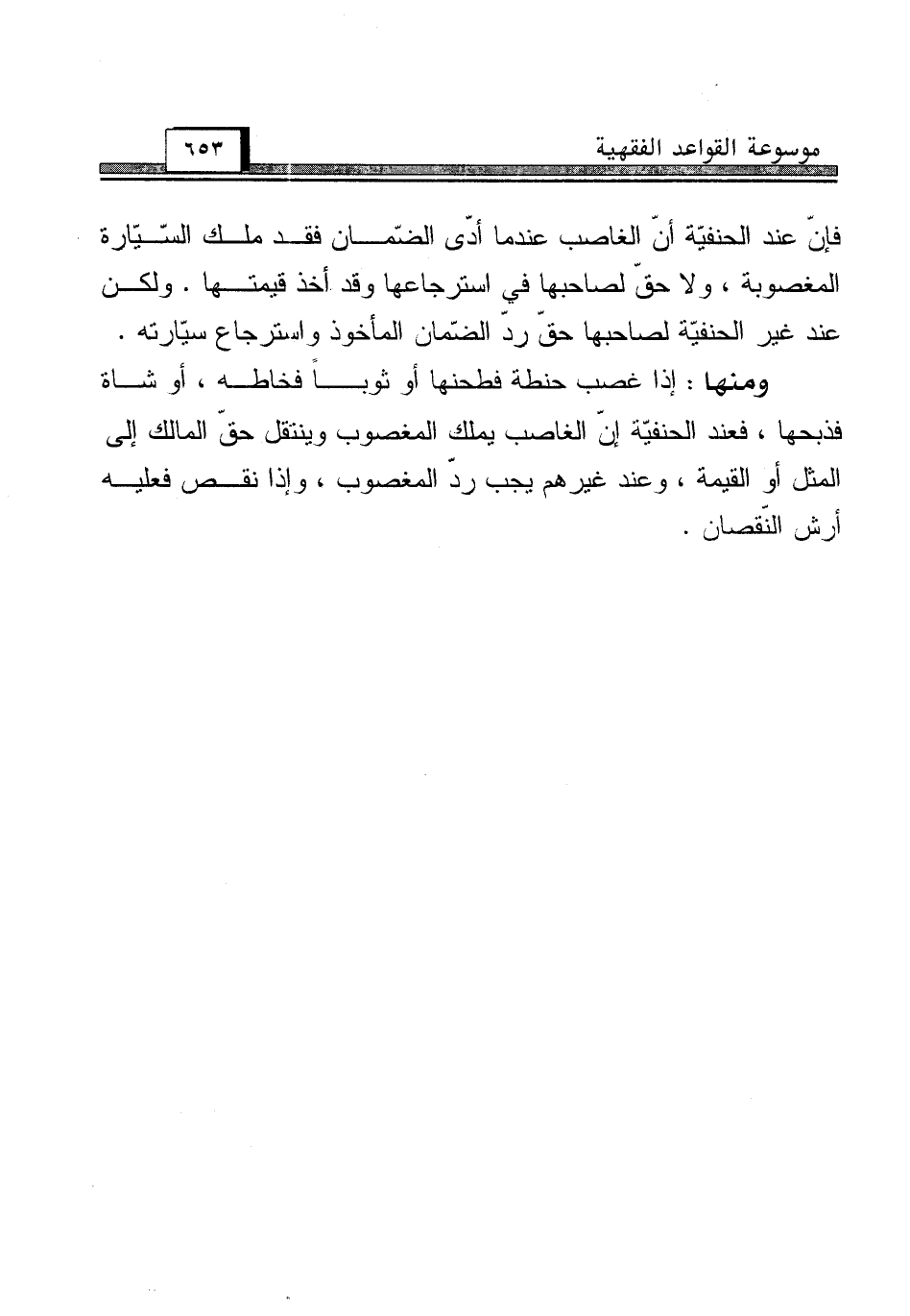 ومنها: إذا غصب حنطة فطحنها أو ثوباً فخاطه، أو شاة فذبحها، فعند الحنفيّة إنّ الغاصب يملك المغصوب وينتقل حقّ المالك إلى المثل أو القيمة، وعند غيرهم يجب ردّ المغصوب، وإذا نقص فعليه أرش النّقصان.