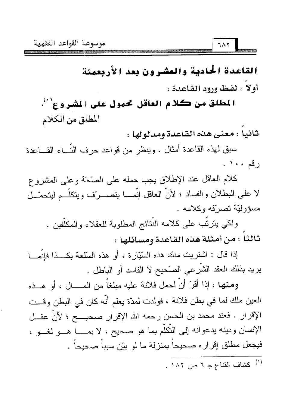 كلام العاقل عند الإطلاق يجب حمله على الصّحّة وعلى المشروع لا على البطلان والفساد؛ لأنّ العاقل إنّما يتصرّف ويتكلّم ليتحمّل مسؤوليّة تصرّفه وكلامه.