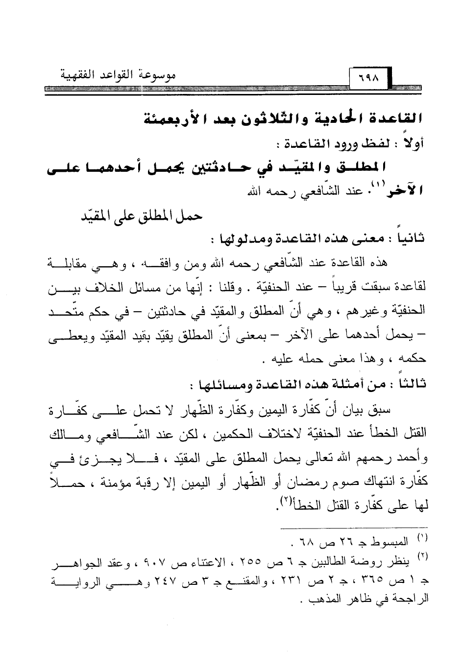 القاعدة الحادية والثّلاثون بعد الأربعمئة [حمل المطلق على المقيّد]