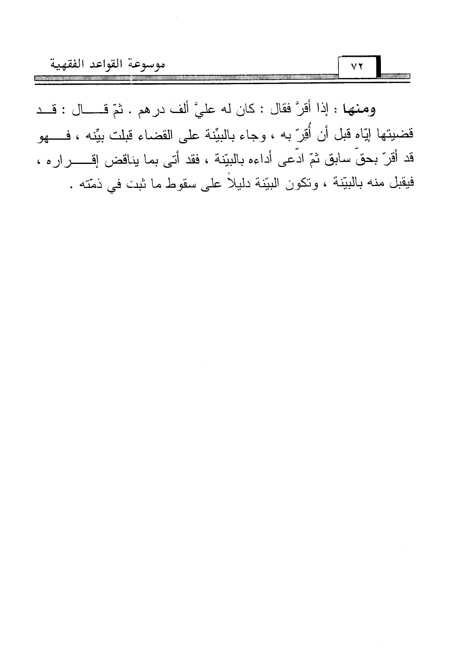 ومنها: إذا أقرَّ فقال: كان له عليَّ ألف درهم. ثمّ قال: قد قضيتها إيّاه قبل أن أُقِرّ به، وجاء بالبيِّنة على القضاء قبلت بيِّنه، فهو قد أقرّ بحقّ سابق ثمّ ادّعى أداءه بالبيّنة، فقد أتى بما يناقض إقراره، فيقبل منه بالبيّنة، وتكون البيّنة دليلاً على سقوط ما ثبت في ذمّته.