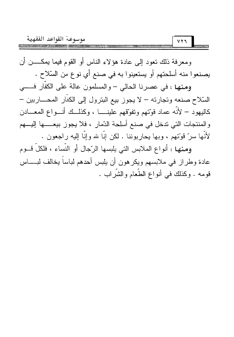 ومنها: في عصرنا الحالي - والمسلمون عالة على الكفّار في السّلاح صنعه وتجارته - لا يجوز بيع البترول إلى الكفّار المحاربين - كاليهود - لأنّه عماد قوّتهم وتفوّقهم علينا، وكذلك أنواع المعادن والمنتجات التي تدخل في صنع أسلحة الدّمار، فلايجوز بيعها إليهم لأنّها سرّ قوّتهم، وبها يحاربوننا. لكن إنّا لله وإنّا إليه راجعون.