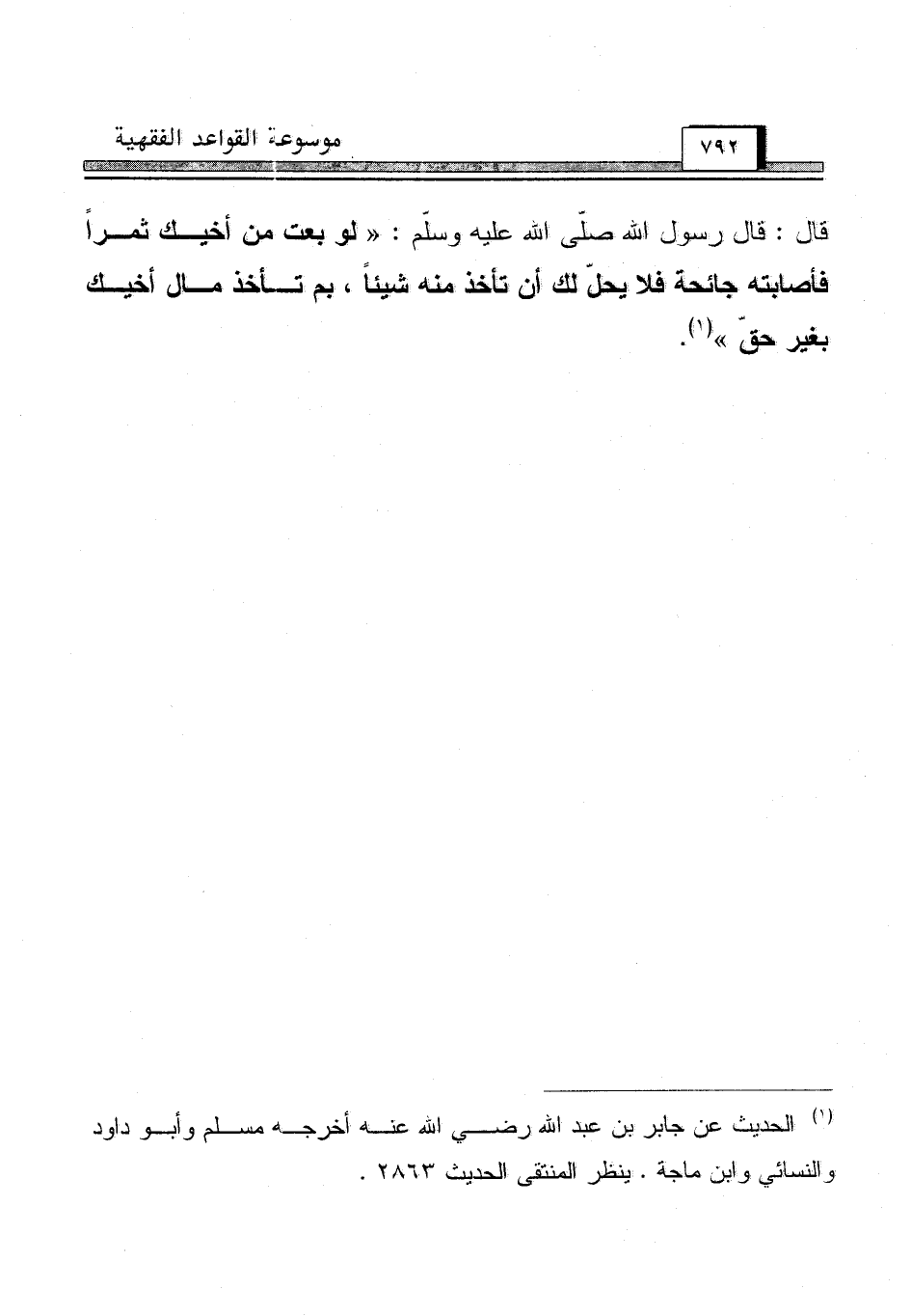 قال: قال رسول الله صلّى الله عليه وسلّم: "لو بعت من أخيك ثمراً فأصابته جائحة فلا يحلّ لك أن تأخذ منه شيئاً، بم تأخذ مال أخيك بغير حقّ" (¬1)