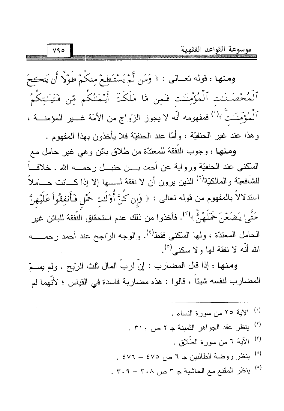 ومنها: قوله تعالى: {وَمَنْ لَمْ يَسْتَطِعْ مِنْكُمْ طَوْلًا أَنْ يَنْكِحَ الْمُحْصَنَاتِ الْمُؤْمِنَاتِ فَمِنْ مَا مَلَكَتْ أَيْمَانُكُمْ مِنْ فَتَيَاتِكُمُ الْمُؤْمِنَاتِ} (¬1) فمفهومه أنّه لا يجوز الزّواج من الأمَة غير المؤمنة، وهذا عند غير الحنفيّة، وأمّا عند الحنفيّة فلا يأخذون بهذا المفهوم.
