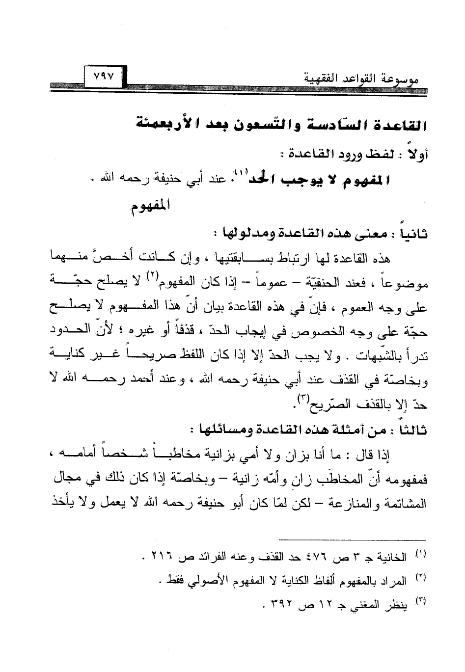 هذه القاعدة لها ارتباط بسابقتيها، وإن كانت أخصَّ منهما موضوعاً، فعند الحنفيّة - عموماً - إذا كان المفهوم (¬2) لا يصلح حجّة على وجه العموم، فإنّ في هذه القاعدة بيان أنّ هذا المفهوم لا يصلح حجّة على وجه الخصوص في إيجاب الحدّ، قذفاً أو غيره؛ لأن الحدود تدرأ بالشّبهات. ولا يجب الحدّ إلا إذا كان اللفظ صريحاً غير كناية وبخاصّة في القذف عند أبي حنيفة رحمه الله، وعند أحمد رحمه الله لا حدّ إلا بالقذف الصّريح (¬3).