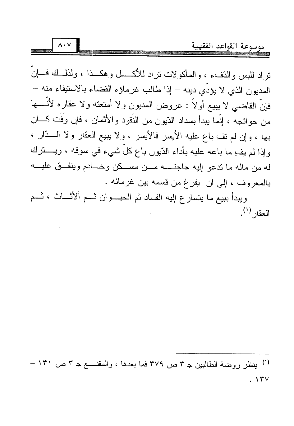 تراد للبس والدّفء، والمأكولات تراد للأكل وهكذا، ولذلك فإنّ المديون الذي لا يؤدّي دينه - إذا طالب غرماؤه القضاء بالاستيفاء منه - فإنّ القاضي لا يبيع أولاً: عروض المديون ولا أمتعته ولا عقاره لأنّها من حوائجه، إنّما يبدأ بسداد الدّيون من النّقود والأثمان، فإن وَفَت كان بها، وإن لم تفِ باع عليه الأيسر فالأيسر، ولا يبيع العقار ولا الدّار، وإذا لم يفِ ما باعه عليه بأداء الدّيون باع كلّ شيء في سوقه، ويترك له من ماله ما تدعو إليه حاجته من مسكن وخادم وينفق عليه بالمعروف، إلى أن يفرغ من قسمه بين غرمائه.