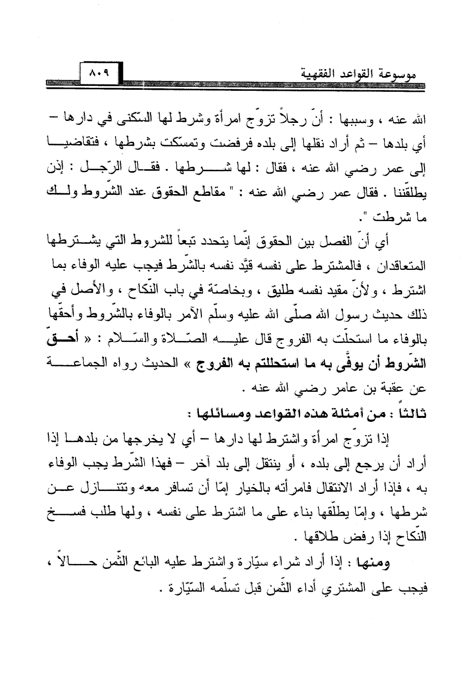 الله عنه، وسببها: أنّ رجلاً تزوّج امرأة وشرط لها السّكنى في دارها - أي بلدها - ثم أراد نقلها إلى بلده فرفضت وتمسّكت بشرطها، فتقاضيا إلى عمر رضي الله عنه، فقال: لها شرطها. فقال الرّجل: إذن يطلقّننا. فقال عمر رضي الله عنه: "مقاطع الحقوق عند الشّروط ولك ما شرطت".