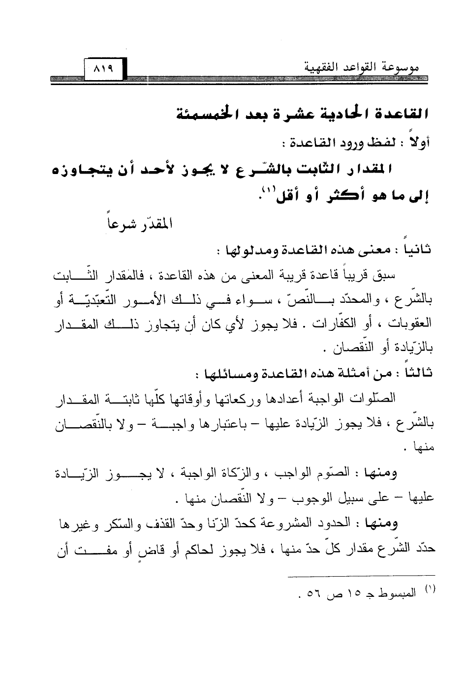 سبق قريباً قاعدة قريبة المعنى من هذه القاعدة، فالمقدار الثّابت بالشّرع، والمحدّد بالنّصّ، سواء في ذلك الأمور التّعبّديّة أو العقوبات، أو الكفّارات. فلا يجوز لأي كان أن يتجاوز ذلك المقدار بالزّيادة أو النّقصان.