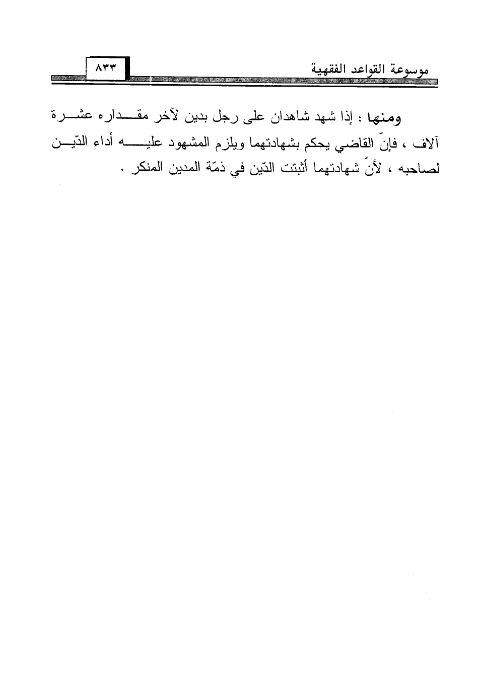 ومنها: إذا شهد شاهدان على رجل بدين لآخر مقداره عشرة آلاف، فإنّ القاضي يحكم بشهادتهما ويلزم المشهود عليه أداء الدّين لصاحبه، لأنّ شهادتهما أثبتت الدّين في ذمّة المدين المنكر.