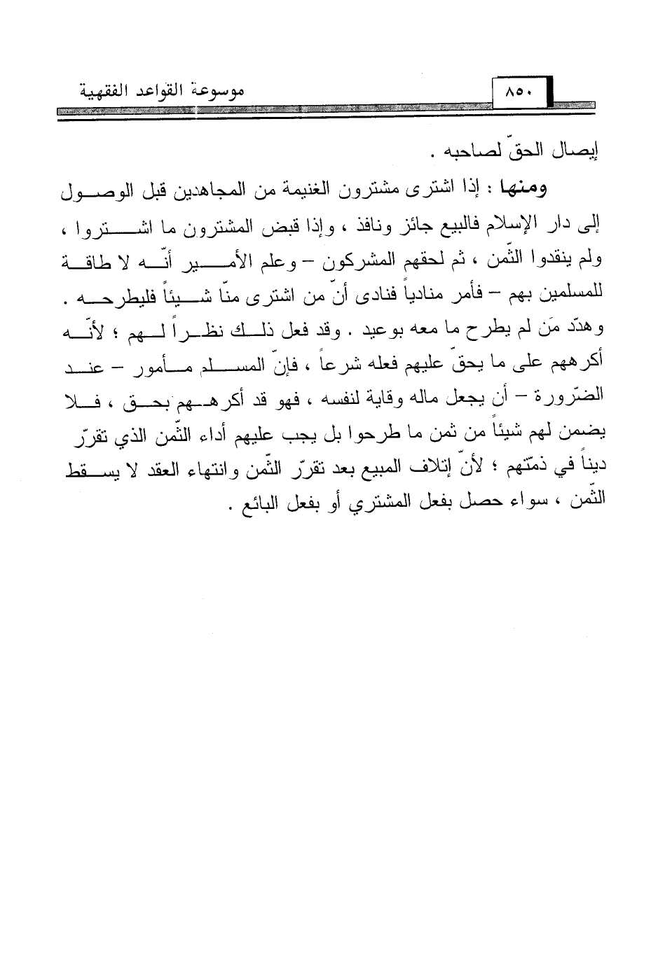 ومنها: إذا اشترى مشترون الغنيمة من المجاهدين قبل الوصول إلى دار الإِسلام فالبيع جائز ونافذ، وإذا قبض المشترون ما اشتروا، ولم ينقدوا الثّمن، ثم لحقهم المشركون - وعلم الأمير أنّه لا طاقة للمسلمين بهم - فأمر منادياً فنادى أنّ من اشترى منّا شيئاً فليطرحه. وهدّد مَن لم يطرح ما معه بوعيد. وقد فعل ذلك نظراً لهم؛ لأنّه أكرههم على ما يحقّ عليهم فعله شرعاً، فإنّ المسلم مأمور - عند الضّرورة - أن يجعل ماله وقاية لنفسه، فهو قد أكرههم بحق، فلا يضمن لهم شيئاً من ثمن ما طرحوا بل يجب عليهم أداء الثّمن الذي تقرّر ديناً في ذمّتهم؛ لأنّ إتلاف المبيع بعد تقرّر الثّمن وانتهاء العقد لا يسقط الثّمن، سواء حصل بفعل المشتري أو بفعل البائع.