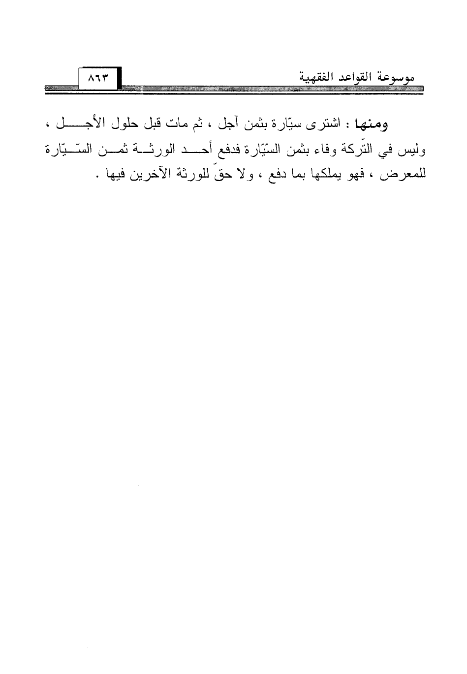 ومنها: اشترى سيّارة بثمن آجل، ثم مات قبل حلول الأجل، وليس في التّركة وفاء بثمن السّيّارة فدفع أحد الورثة ثمن السّيّارة للمعرض، فهو يملكها بما دفع، ولا حقّ للورثة الآخرين فيها.