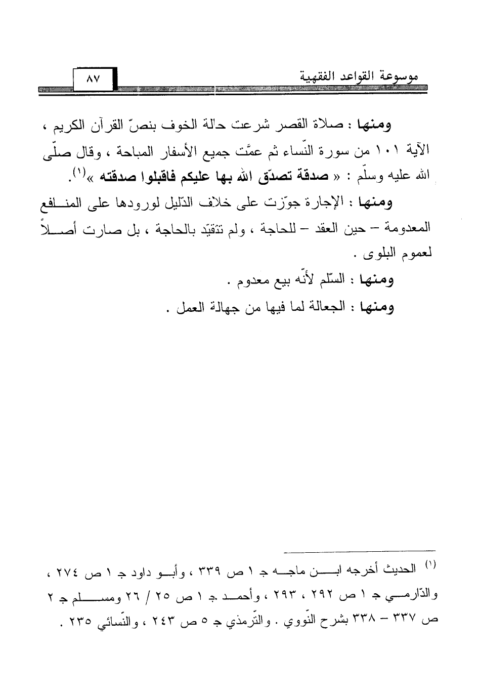 ومنها: صلاة القصر شرعت حالة الخوف بنصّ القرآن الكريم، الآية 101 من سورة النّساء ثم عمَّت جميع الأسفار المباحة، وقال صلّى الله عليه وسلّم: "صدقة تصدّق الله بها عليكم فاقبلوا صدقته" (¬1).