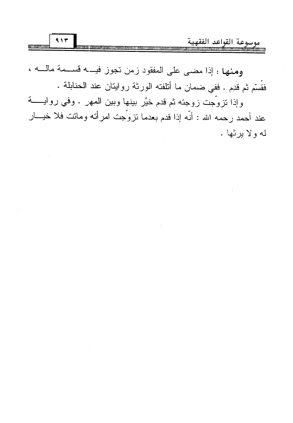 ومنها: إذا مضى على المفقود زمن تجوز فيه قسمة ماله، فقُسّم ثم قدِم. ففي ضمان ما أتلفته الورثة روايتان عند الحنابلة.