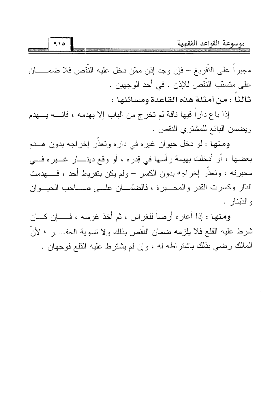 ومنها: لو دخل حيوان غيره في داره وتعذّر إخراجه بدون هدم بعضها، أو أدخلت بهيمة رأسها في قِدره، أو وقع دينار غيره في محبرته، وتعذّر إخراجه بدون الكسر - ولم يكن بتفريط أحد، فهدمت الدّار وكسرت القدر والمحبرة، فالضّمان على صاحب الحيوان والدّينار.