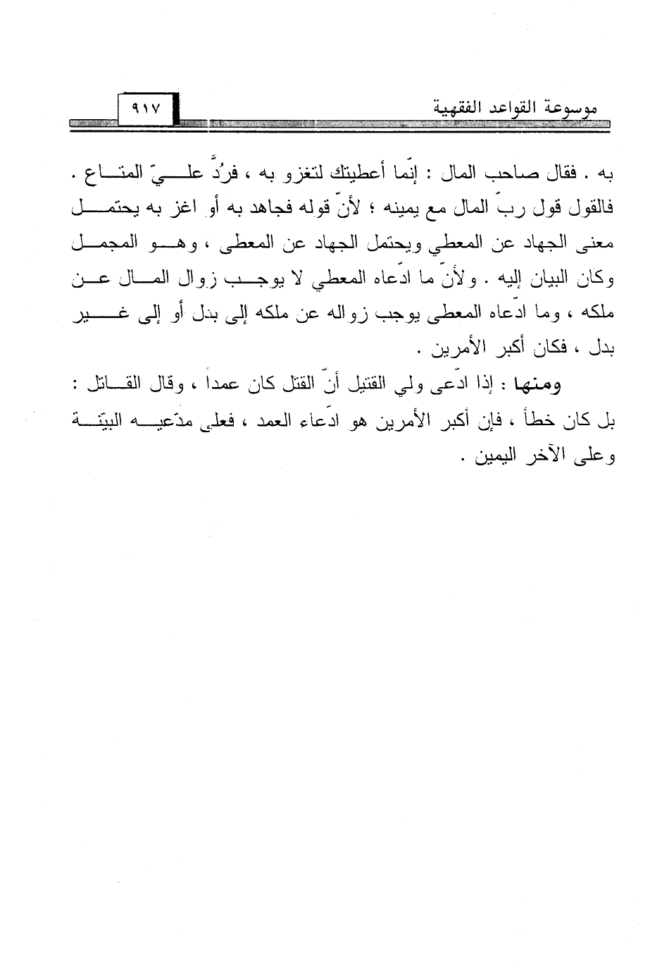 ومنها: إذا ادّعى ولي القتيل أنّ القتل كان عمداً، وقال القاتل: بل كان خطأ، فإن أكبر الأمرين هو ادّعاء العمد، فعلى مدّعيه البيّنة وعلى الآخر اليمين.