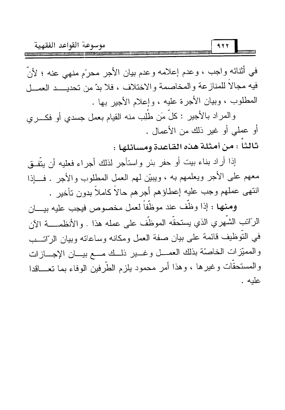 ومنها: إذا وظّف عند موظّفاً لعمل مخصوص فيجب عليه بيان الرّاتب الشّهري الذي يستحقّه الموظّف على عمله هذا. والأنظمة الآن في التّوظيف قائمة على بيان صفة العمل ومكانه وساعاته وبيان الرّاتب والمميّزات الخاصّة بذلك العمل وغير ذلك مع بيان الإجازات والمستحقّات وغيرها، وهذا أمر محمود يلزم الطّرفين الوفاء بما تعاقدا عليه.