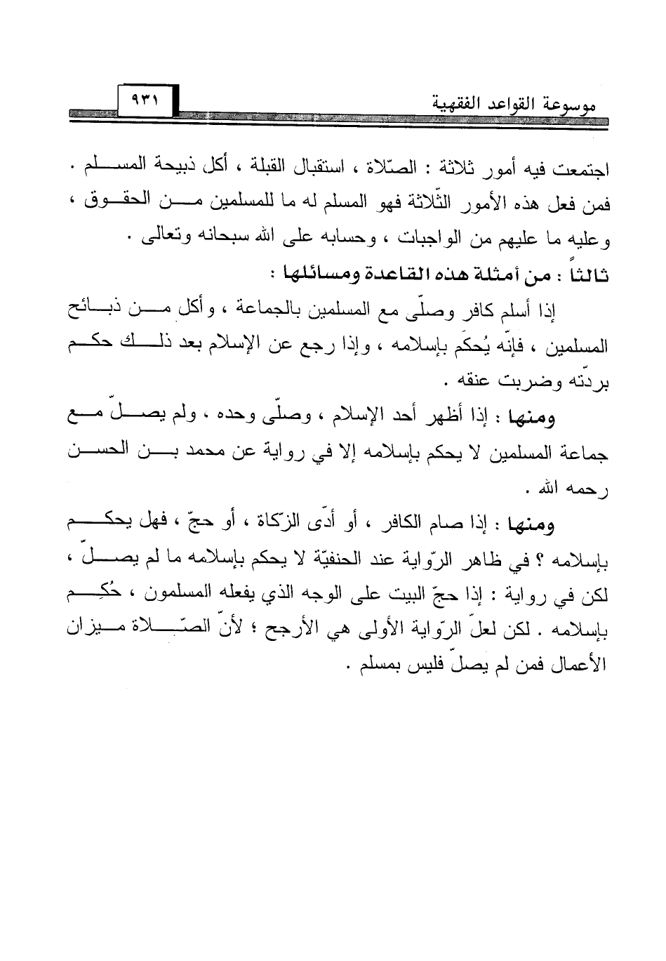 ومنها: إذا صام الكافر، أو أدّى الزّكاة، أو حجّ، فهل يحكم بإسلامه؟ في ظاهر الرّواية عند الحنفيّة لا يحكم بإسلامه ما لم يصلّ، لكن في رواية: إذا حجّ البيت على الوجه الذي يفعله المسلمون، حُكِم بإسلامه. لكن لعلّ الرّواية الأولى هي الأرجح؛ لأنّ الصّلاة ميزان الأعمال فمن لم يصلّ فليس بمسلم.