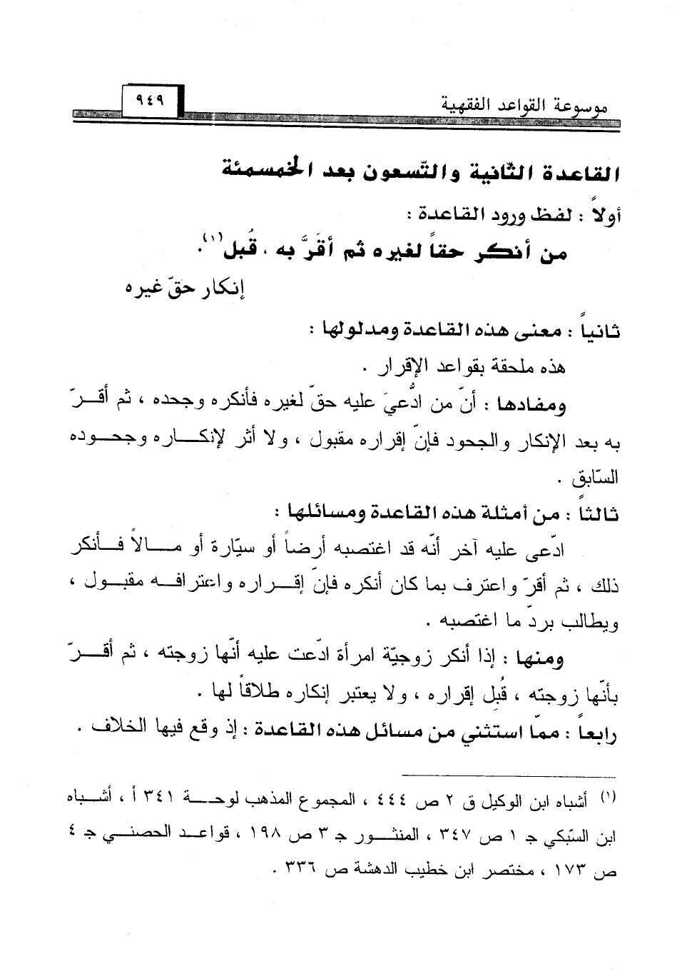 (¬1) أشباه ابن الوكيل ق 2 ص 444، المجموع المذهب لوحة 341 أ، أشباه ابن السّبكي جـ 1 ص 347، المنثور جـ 3 ص 198، قواعد الحصني جـ 4 ص 173، مختصر ابن خطيب الدهشة ص 336.
