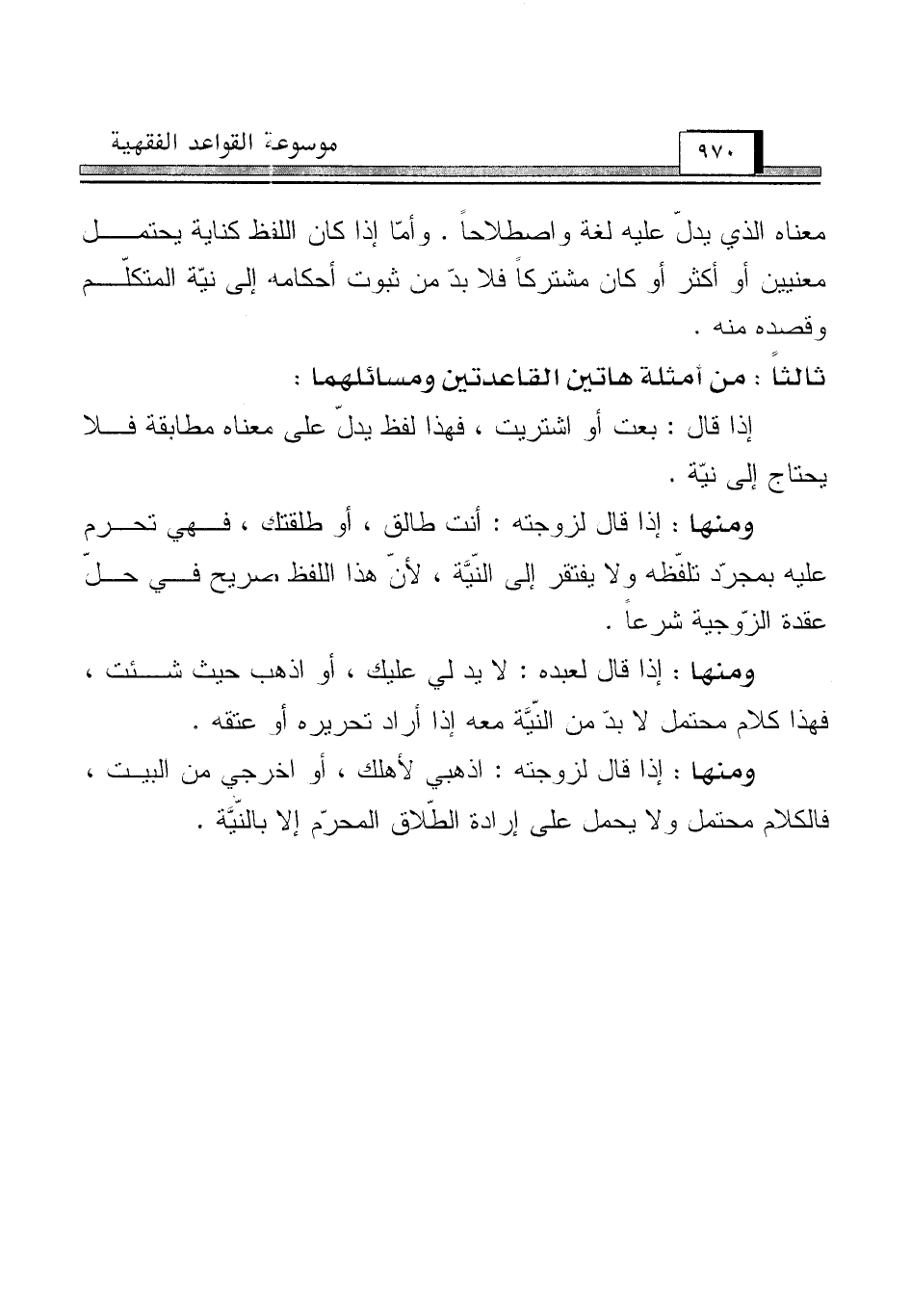 ومنها: إذا قال لعبده: لا يد لي عليك، أو اذهب حيث شئت، فهذا كلام محتمل لا بدّ من النّيَّة معه إذا أراد تحريره أو عتقه.