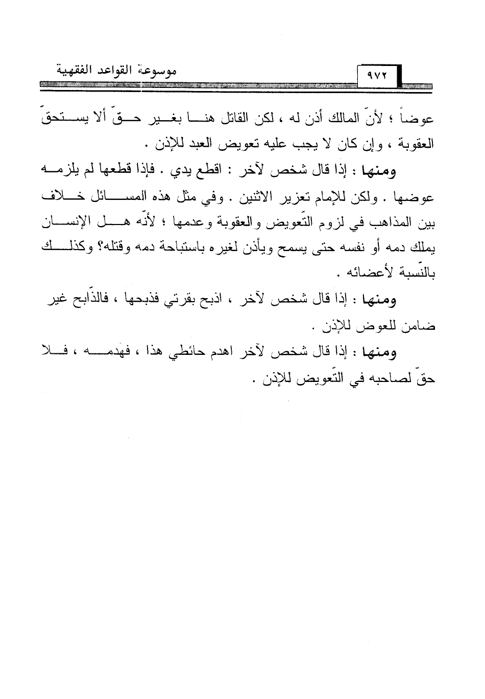 ومنها: إذا قال شخص لآخر: اقطع يدي. فإذا قطعها لم يلزمه عوضها. ولكن للإمام تعزير الاثنين. وفي مثل هذه المسائل خلاف بين المذاهب في لزوم التّعويض والعقوبة وعدمها؛ لأنّه هل الإنسان يملك دمه أو نفسه حتى يسمح ويأذن لغيره باستباحة دمه وقتله؟ وكذلك بالنّسبة لأعضائه.