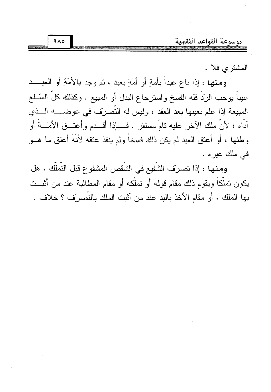 ومنها: إذا باع عبداً بأمَةٍ أو أمَةٍ بعبد، ثم وجد بالأمَةِ أو العبد عيباً يوجب الرّدّ فله الفسخ واسترجاع البدل أو المبيع. وكذلك كلّ السّلع المبيعة إذا علم بعيبها بعد العقد، وليس له التّصرّف في عوضه الذي أدّاه؛ لأنّ ملك الآخر عليه تامّ مستقر. فإذا أقدم وأعتق الأمَةَ أو وطئها، أو أعتق العبد لم يكن ذلك فسخاً ولم ينفذ عتقه لأنّه أعتق ما هو في ملك غيره.