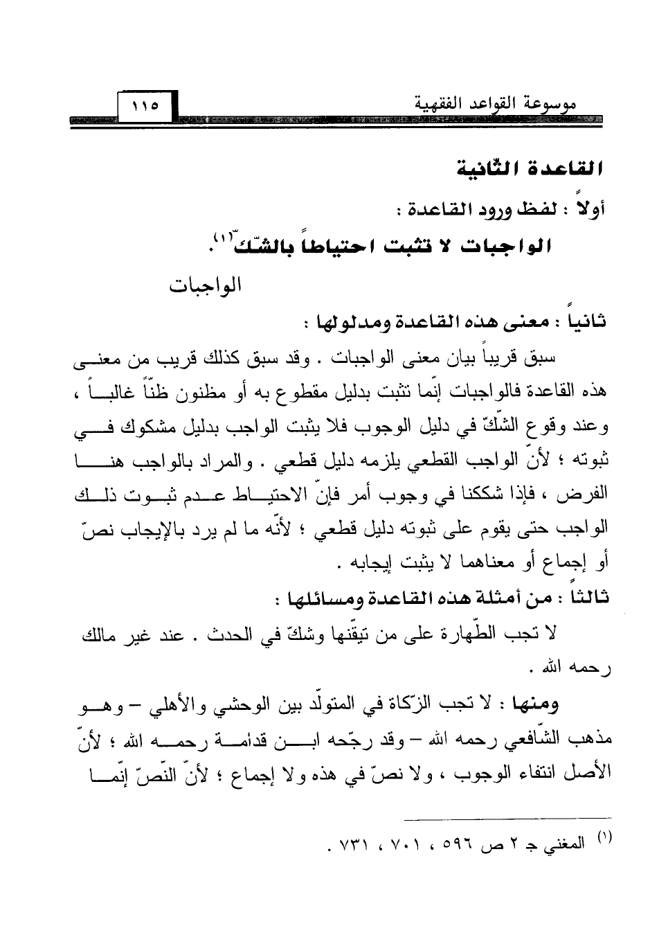 سبق قريباً بيان معنى الواجبات. وقد سبق كذلك قريب من معنى هذه القاعدة فالواجبات إنّما تثبت بدليل مقطوع به أو مظنون ظنّاً غالباً، وعند وقوع الشّكّ في دليل الوجوب فلا يثبت الواجب بدليل مشكوك في ثبوته؛ لأنّ الواجب القطعي يلزمه دليل قطعي. والمراد بالواجب هنا الفرض، فإذا شككنا في وجوب أمر فإنّ الاحتياط عدم ثبوت ذلك الواجب حتى يقوم على ثبوته دليل قطعي؛ لأنّه ما لم يرد بالإيجاب نصّ أو إجماع أو معناهما لا يثبت إيجابه.