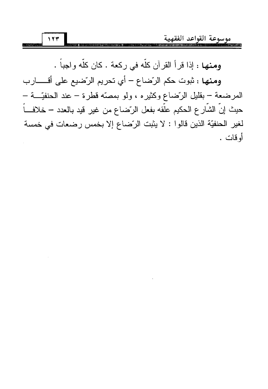 ومنها: ثبوت حكم الرّضاع - أي تحريم الرّضيع على أقارب المرضعة - بقليل الرّضاع وكثيره، ولو بمصّه قطرة - عند الحنفيّة - حيث إنّ الشّارع الحكيم علّقه بفعل الرّضاع من غير قيد بالعدد - خلافاً لغير الحنفيّة الذين قالوا: لا يثبت الرّضاع إلا بخمس رضعات في خمسة أوقات.