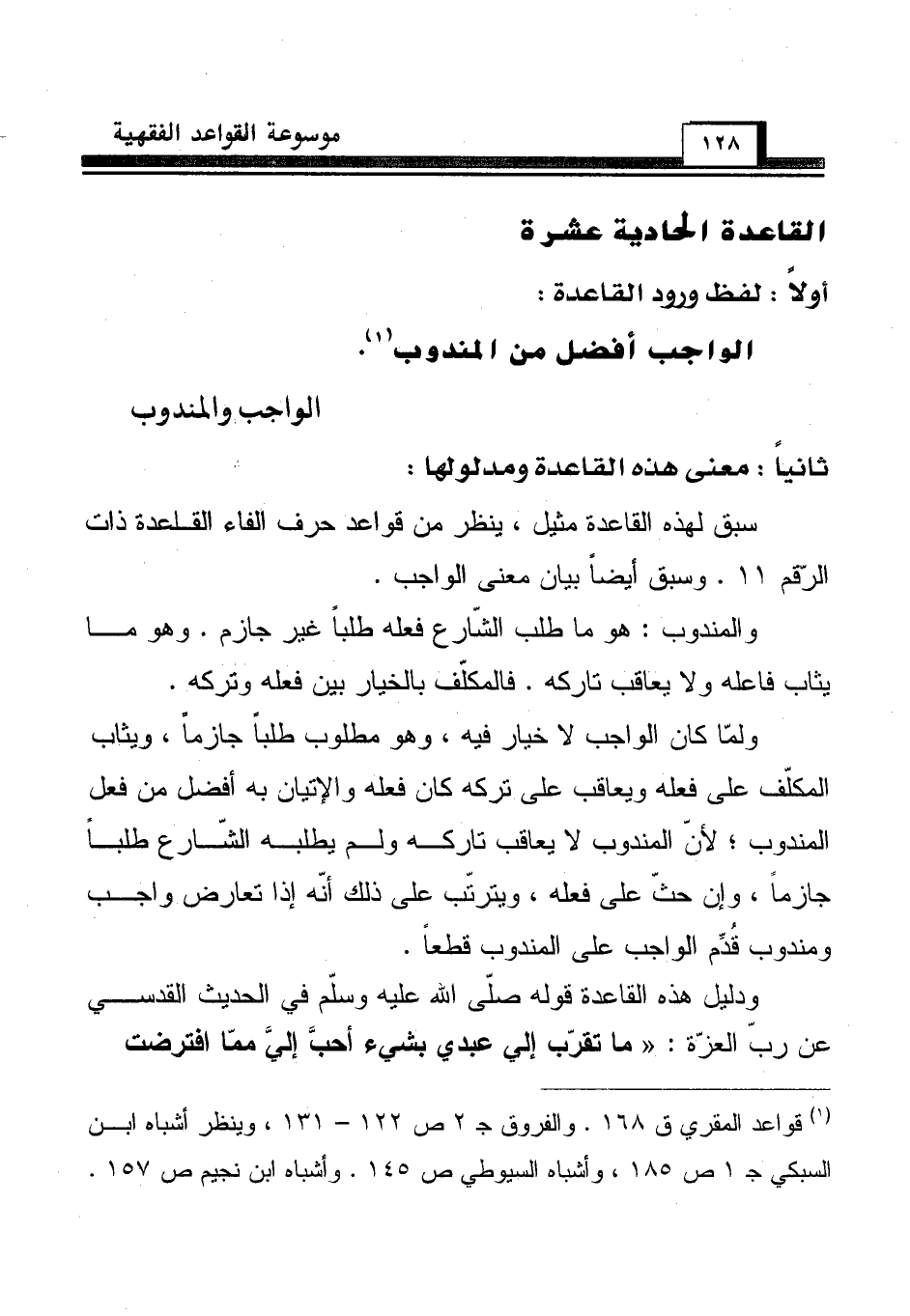 ودليل هذه القاعدة قوله صلّى الله عليه وسلّم في الحديث القدسي عن ربّ العزّة: "ما تقرّب إلى عبدي بشيء أحبَّ إليَّ ممّا افترضت