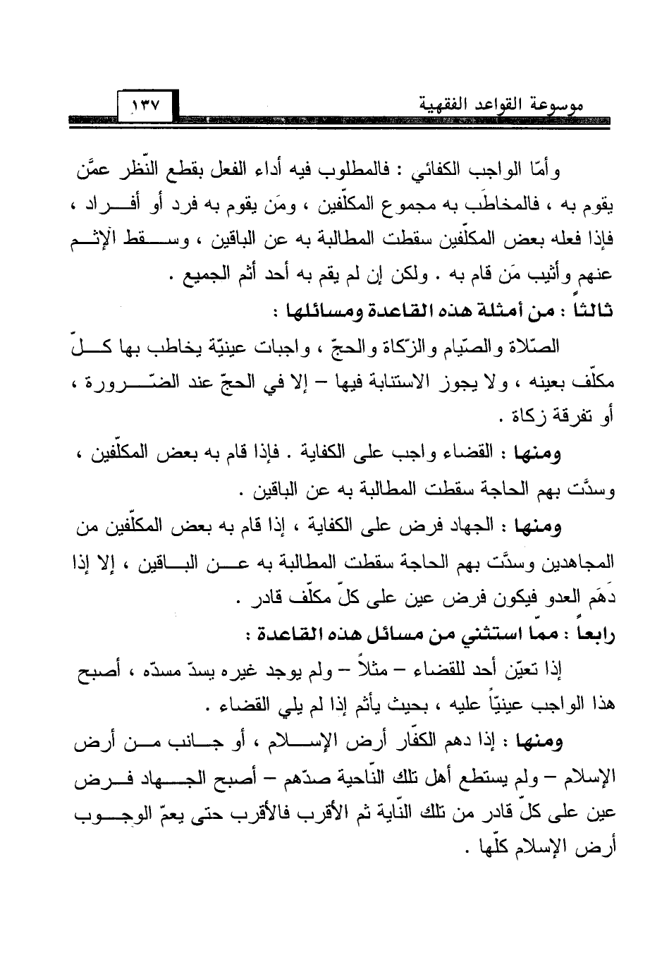 ومنها: الجهاد فرض على الكفاية، إذا قام به بعض المكلّفين من المجاهدين وسدَّت بهم الحاجة سقطت المطالبة به عن الباقين، إلا إذا دَهَم العدو فيكون فرض عين على كلّ مكلّف قادر.
