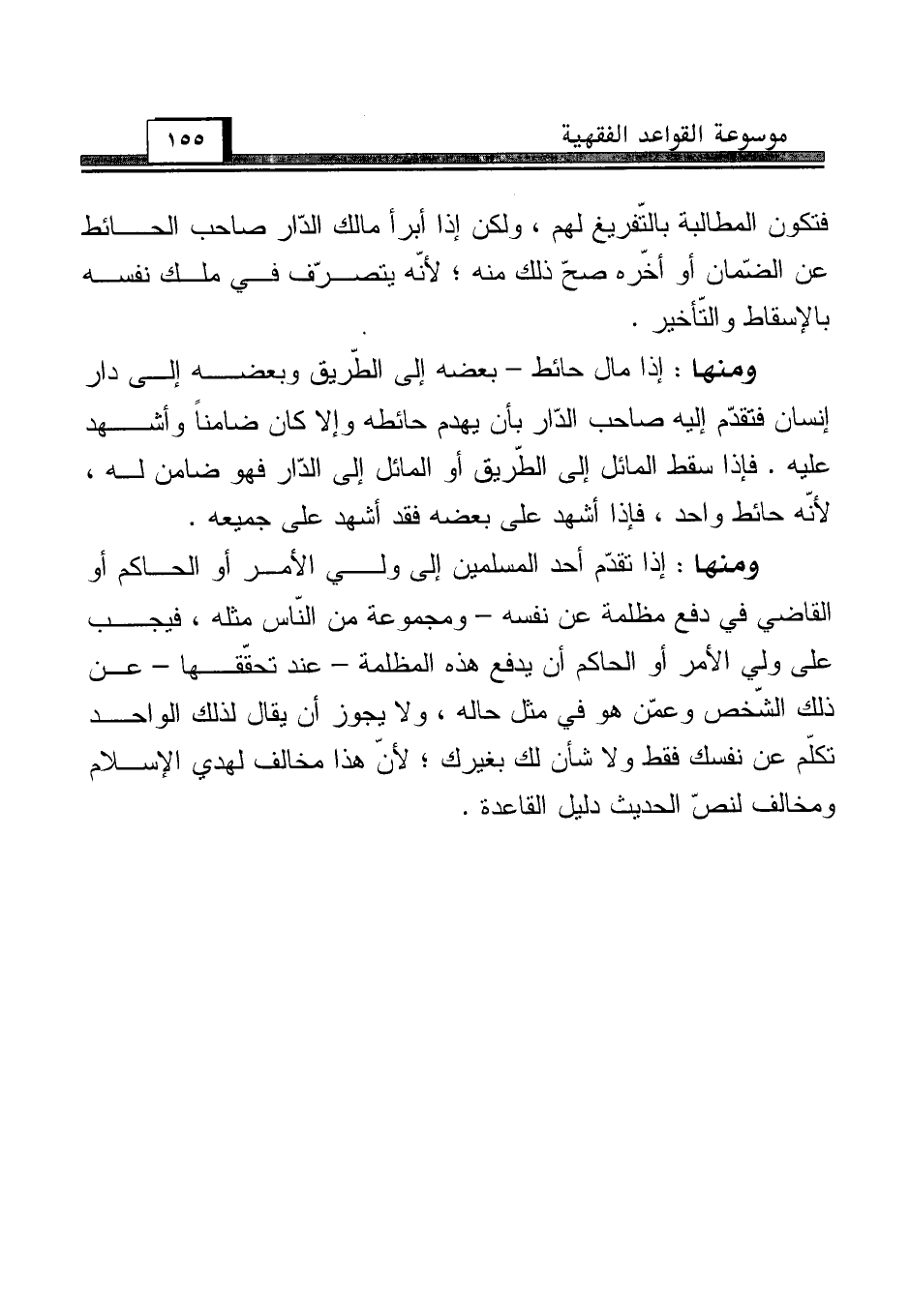 ومنها: إذا مال حائط - بعضه إلى الطّريق وبعضه إلى دار إنسان فتقدّم إليه صاحب الدّار بأن يهدم حائطه وإلا كان ضامناً وأشهد عليه. فإذا سقط المائل إلى الطّريق أو المائل إلى الدّار فهو ضامن له، لأنّه حائط واحد، فإذا أشهد على بعضه فقد أشهد على جميعه.