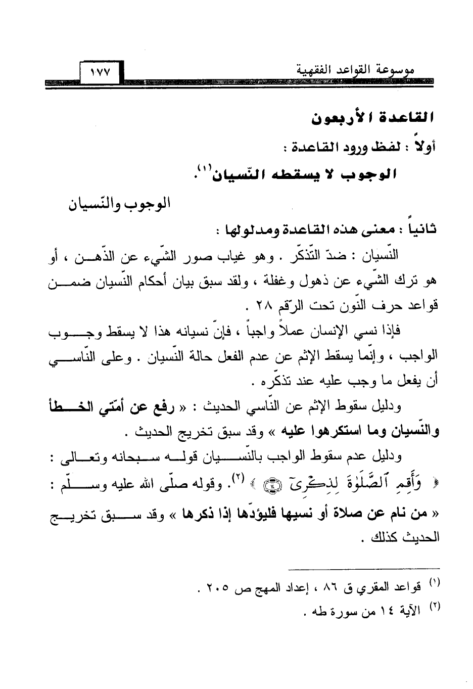 ودليل عدم سقوط الواجب بالنّسيان قوله سبحانه وتعالى: {وَأَقِمِ الصَّلَاةَ لِذِكْرِي (14)} (¬2). وقوله صلّى الله عليه وسلّم: "من نام عن صلاة أو نسيها فليؤدّها إذا ذكرها" وقد سبق تخريج الحديث كذلك.