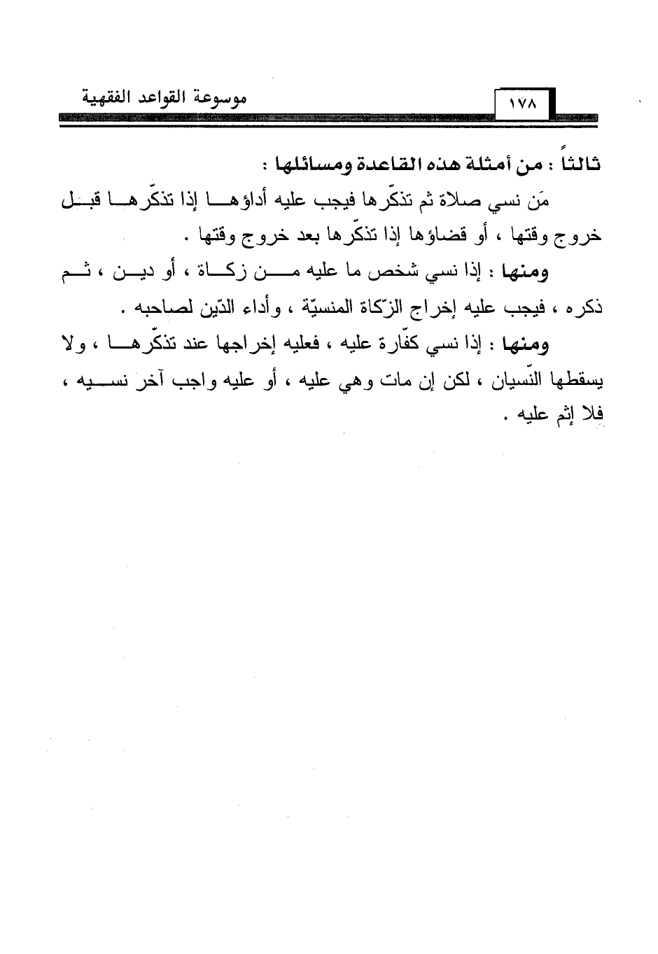 ومنها: إذا نسي شخص ما عليه من زكاة، أو دين، ثم ذكره، فيجب عليه إخراج الزّكاة المنسيّة، وأداء الدّين لصاحبه.