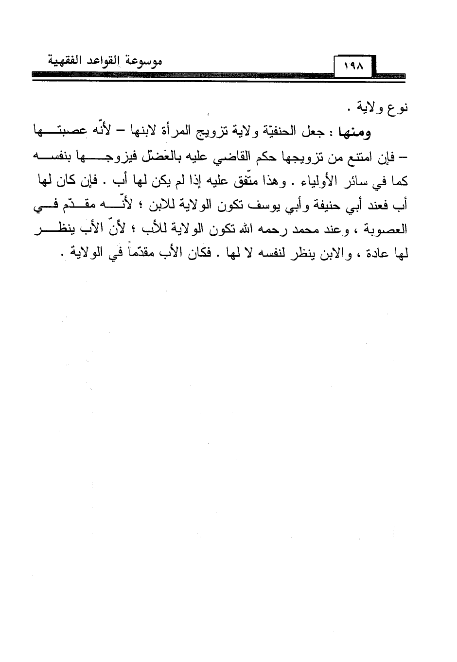 ومنها: جعل الحنفيّة ولاية تزويج المرأة لابنها - لأنّه عصبتها - فإن امتنع من تزويجها حكم القاضي عليه بالعَضْل فيزوجها بنفسه كما في سائر الأولياء. وهذا متّفق عليه إذا لم يكن لها أب. فإن كان لها أب فعند أبي حنيفة وأبي يوسف تكون الولاية للابن؛ لأنّه مقدّم في العصوبة، وعند محمَّد رحمه الله تكون الولاية للأب؛ لأنّ الأب ينظر لها عادة، والابن ينظر لنفسه لا لها. فكان الأب مقدّماً في الولاية.