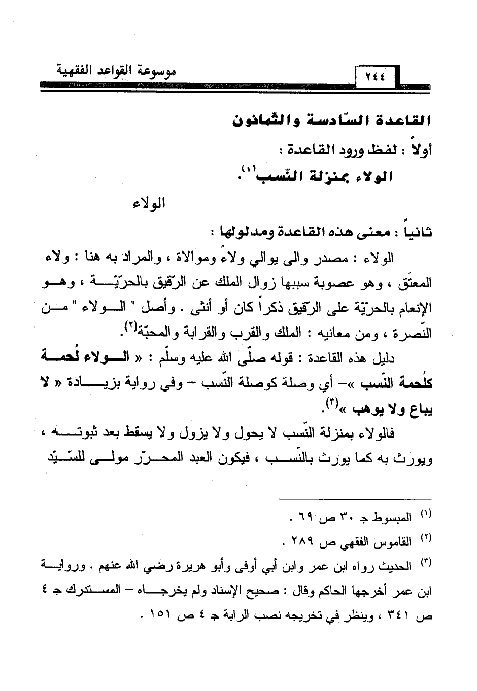 دليل هذه القاعدة: قوله صلّى الله عليه وسلّم: "الولاء لُحمة كلُحمة النّسب" - أي وصلة كوصلة النّسب - وفي رواية بزيادة "لا يباع ولا يوهب" (¬3).