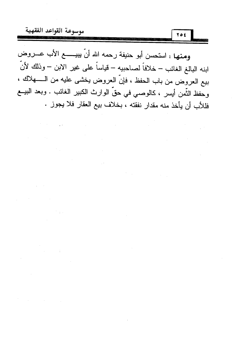 ومنها: استحسن أبو حنيفة رحمه الله أنّ يبيع الأب عروض ابنه البالغ الغائب - خلافاً لصاحبيه - قياساً على غير الابن - وذلك لأنّ بيع العروض من باب الحفظ، فإنّ العروض يخشى عليه من الهلاك، وحفظ الثّمن أيسر، كالوصي في حقّ الوارث الكبير الغائب. وبعد البيع فللأب أن يأخذ منه مقدار نفقته، بخلاف بيع العقار فلا يجوز.
