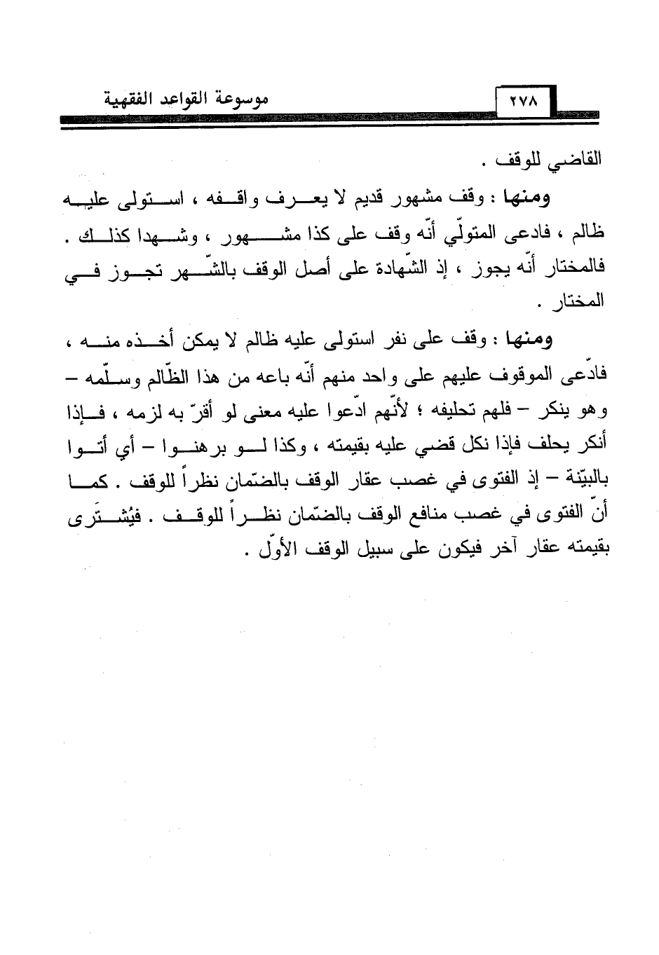 ومنها: وقف على نفر استولى عليه ظالم لا يمكن أخذه منه، فادّعى الموقوف عليهم على واحد منهم أنّه باعه من هذا الظّالم وسلّمه - وهو ينكر - فلهم تحليفه؛ لأنّهم ادّعوا عليه معنى لو أقرّ به لزمه، فإذا أنكر يحلف فإذا نكل قضي عليه بقيمته، وكذا لو برهنوا - أي أتوا بالبيّنة - إذ الفتوى في غصب عقار الوقف بالضّمان نظراً للوقف. كما أنّ الفتوى في غصب منافع الوقف بالضّمان نظراً للوقف. فيُشتَرى بقيمته عقار آخر فيكون على سبيل الوقف الأوّل.