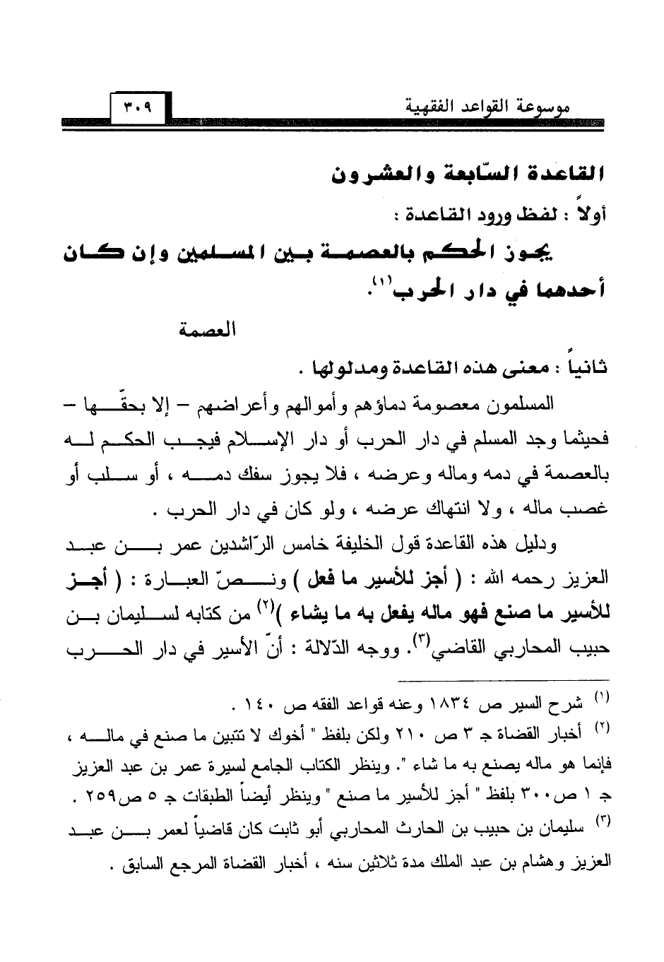 ودليل هذه القاعدة قول الخليفة خامس الرّاشدين عمر بن عبد العزيز رحمه الله: (أجز للأسير ما فعل) ونصّ العبارة: (أجز للأسير ما صنع فهو ماله يفعل به ما يشاء) (¬2) من كتابه لسليمان بن حبيب المحاربي القاضي (¬3). ووجه الدّلالة: أنّ الأسير في دار الحرب