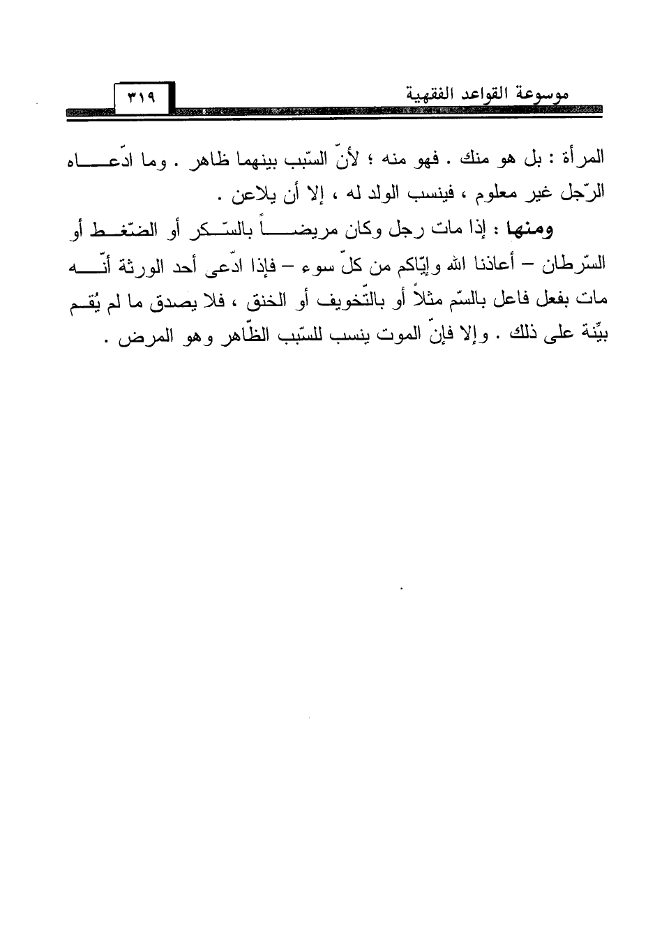 ومنها: إذا مات رجل وكان مريضاً بالسّكر أو الضّغط أو السّرطان - أعاذنا الله وإيّاكم من كلّ سوء - فإذا ادّعى أحد الورثة أنّه مات بفعل فاعل بالسّم مثلاً أو بالتّخويف أو الخنق، فلا يصدق ما لم يُقم بيِّنة على ذلك. وإلا فإنّ الموت ينسب للسّبب الظّاهر وهو المرض.