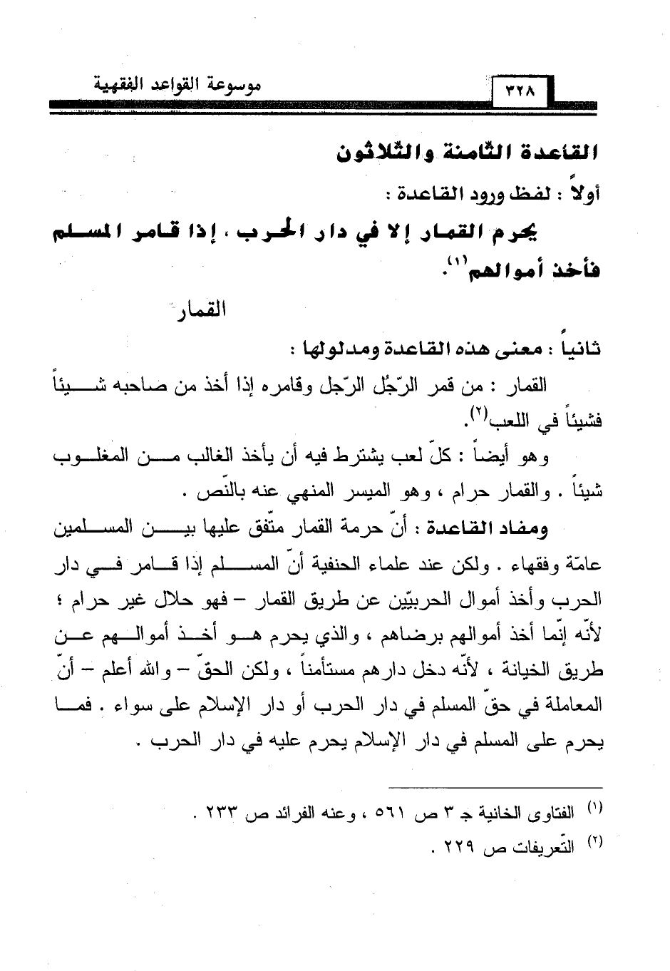 ومفاد القاعدة: أنّ حرمة القمار متّفق عليها بين المسلمين عامّة وفقهاء. ولكن عند علماء الحنفية أنّ المسلم إذا قامر في دار الحرب وأخذ أموال الحربيّين عن طريق القمار - فهو حلال غير حرام؛ لأنّه إنّما أخذ أموالهم برضاهم، والذي يحرم هو أخذ أموالهم عن طريق الخيانة, لأنّه دخل دارهم مستأمناً، ولكن الحقّ - والله أعلم - أنّ المعاملة في حقّ المسلم في دار الحرب أو دار الإسلام على سواء. فما يحرم على المسلم في دار الإسلام يحرم عليه في دار الحرب.