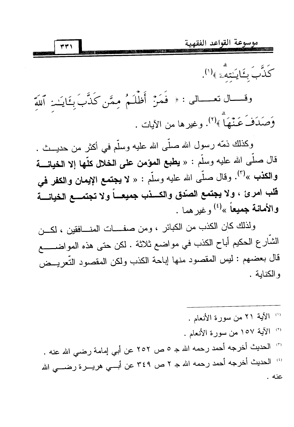 وكذلك ذمّه رسول الله صلّى الله عليه وسلّم في أكثر من حديث. قال صلّى الله عليه وسلّم: "يطبع المؤمن على الخلال كلّها إلا الخيانة والكذب" (¬3). وقال صلّى الله عليه وسلّم: "لا يجتمع الإيمان والكفر في قلب امرئ، ولا يجتمع الصّدق والكذب جميعاً ولا تجتمع الخيانة والأمانة جميعاً" (¬4) وغيرهما.