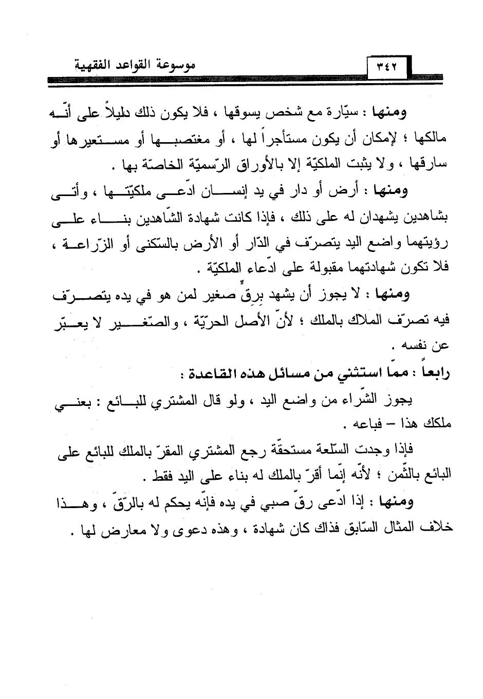 ومنها: سيّارة مع شخص يسوقها، فلا يكون ذلك دليلاً على أنّه مالكها؛ لإمكان أن يكون مستأجراً لها, أو مغتصبها أو مستعيرها أو سارقها، ولا يثبت الملكيّة إلا بالأوراق الرّسميّة الخاصّة بها.