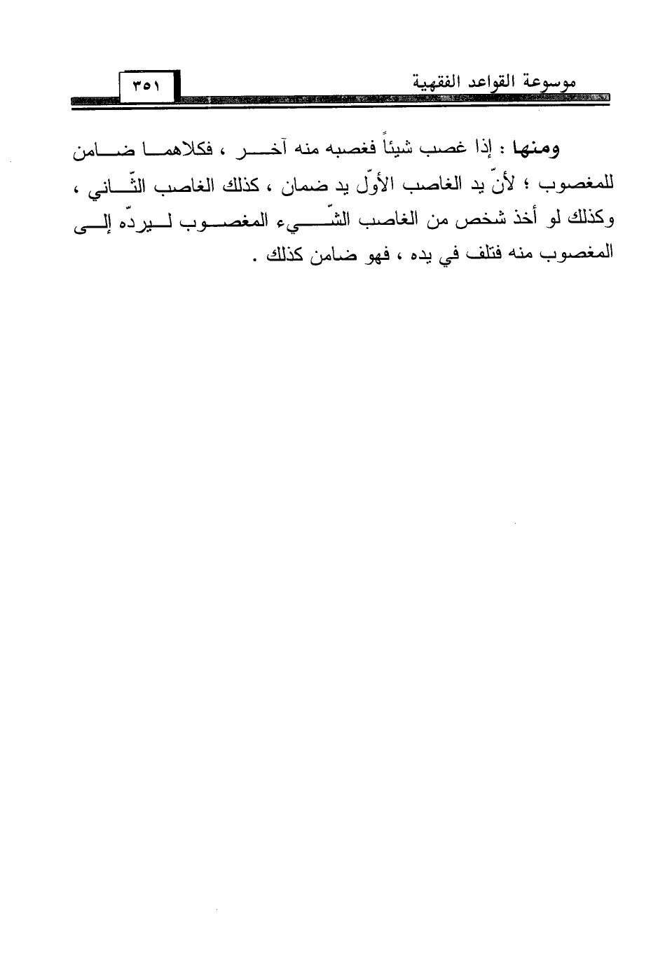 ومنها: إذا غصب شيئاً فغصبه منه آخر، فكلاهما ضامن للمغصوب؛ لأنّ يد الغاصب الأوّل يد ضمان، كذلك الغاصب الثّاني، وكذلك لو أخذ شخص من الغاصب الشّيء المغصوب ليردّه إلى المغصوب منه فتلف في يده، فهو ضامن كذلك.