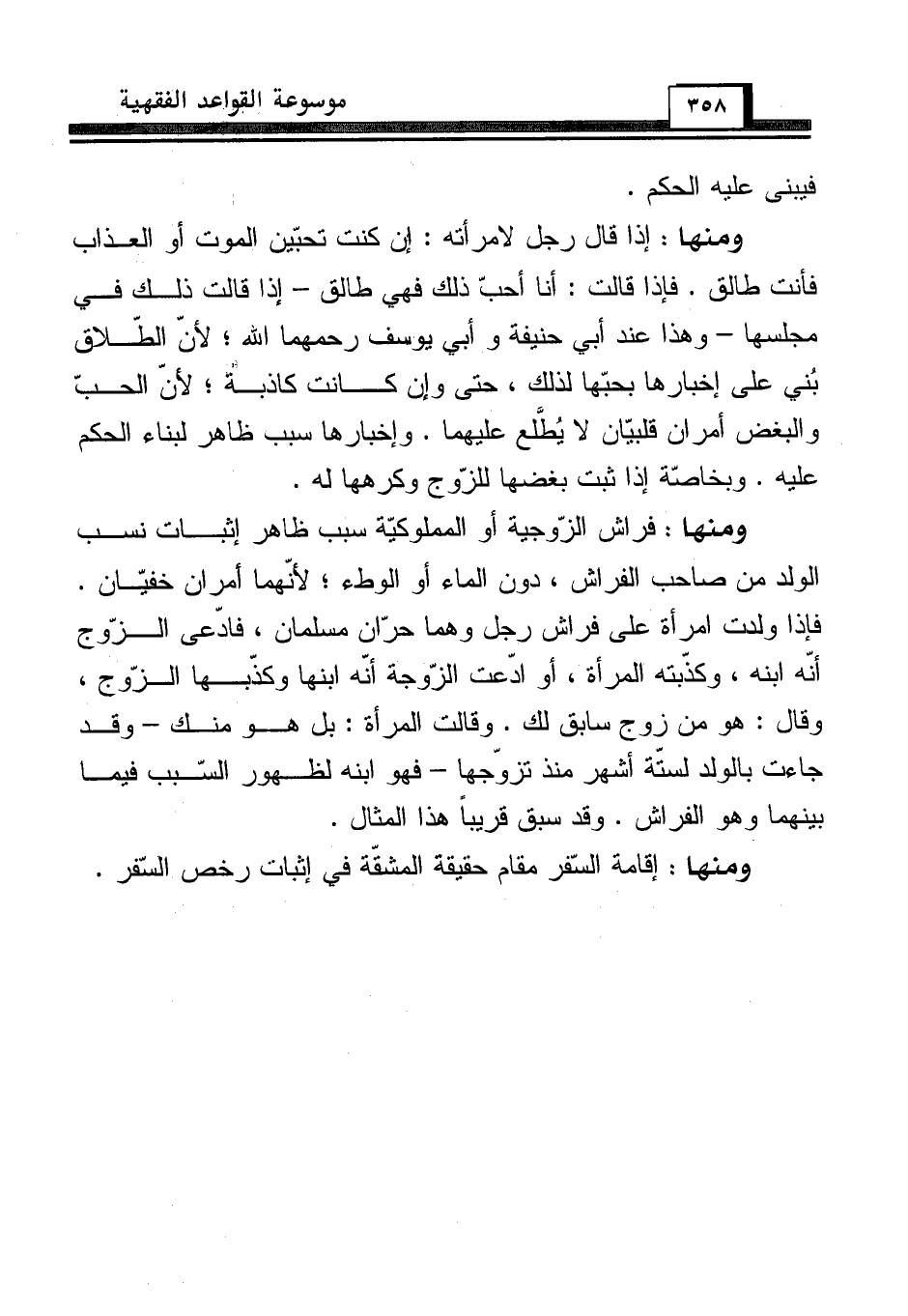 ومنها: فراش الزّوجية أو المملوكيّة سبب ظاهر إثبات نسب الولد من صاحب الفراش، دون الماء أو الوطء؛ لأنّهما أمران خفيّان. فإذا ولدت امرأة على فراش رجل وهما حرّان مسلمان، فادّعى الزّوج أنّه ابنه، وكذّبته المرأة، أو ادّعت الزّوجة أنّه ابنها وكذّبها الزّوج، وقال: هو من زوج سابق لك. وقالت المرأة: بل هو منك - وقد جاءت بالولد لستة أشهر منذ تزوّجها - فهو ابنه لظهور السّبب فيما بينهما وهو الفراش. وقد سبق قريباً هذا المثال.