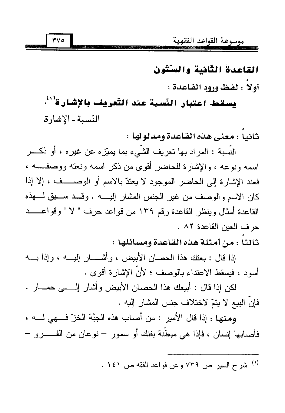 النّسبة: المراد بها تعريف الشّيء بما يميّزه عن غيره، أو ذكر اسمه ونوعه، والإشارة للحاضر أقوى من ذكر اسمه ونعته ووصفه، فعند الإشارة إلى الحاضر الموجود لا يعتدّ بالاسم أو الوصف، إلا إذا كان الاسم والوصف من غير الجنس المشار إليه. وقد سبق لهذه القاعدة أمثال وينظر القاعدة رقم 139 من قواعد حرف "لا" وقواعد حرف العين القاعدة 82.