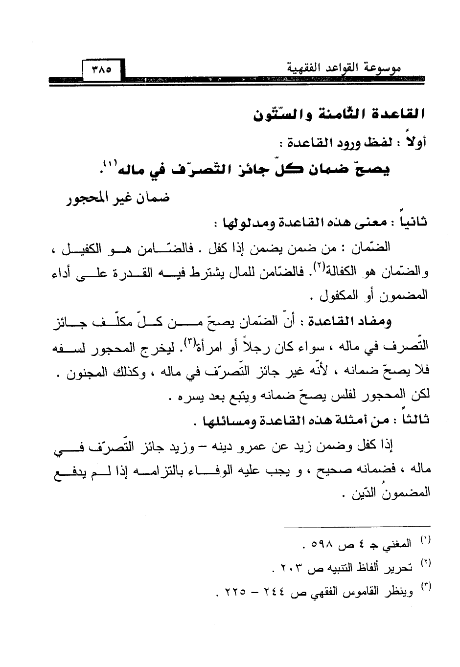 ومفاد القاعدة: أنّ الضّمان يصحّ من كلّ مكلّف جائز التّصرف في ماله، سواء كان رجلاً أو امرأة (¬3). ليخرج المحجور لسفه فلا يصحّ ضمانه، لأنّه غير جائز التّصرّف في ماله، وكذلك المجنون. لكن المحجور لفلس يصحّ ضمانه ويتبع بعد يسره.